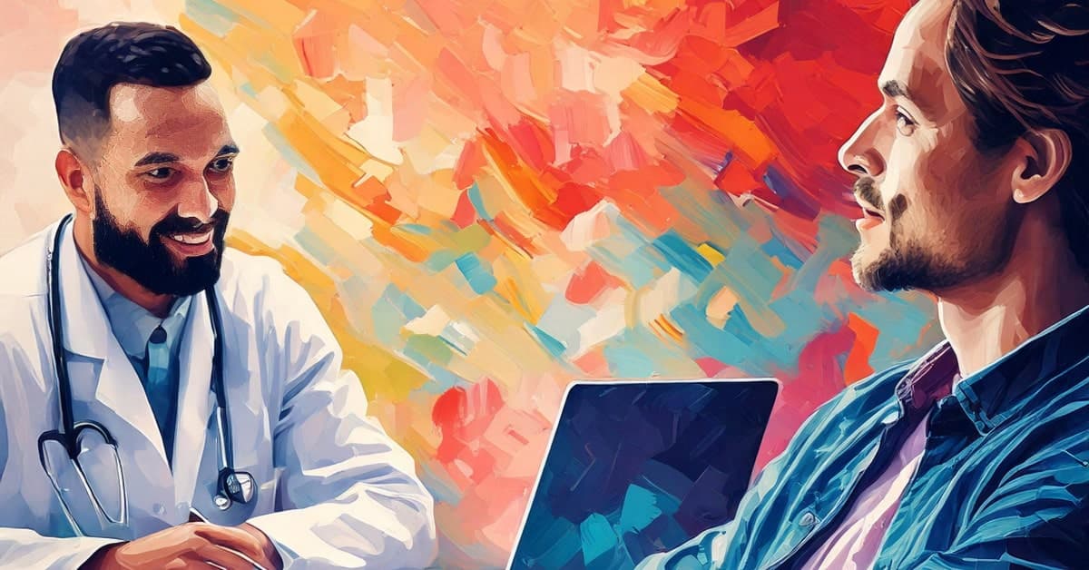 A doctor and patient having a conversation with a colorful abstract background.